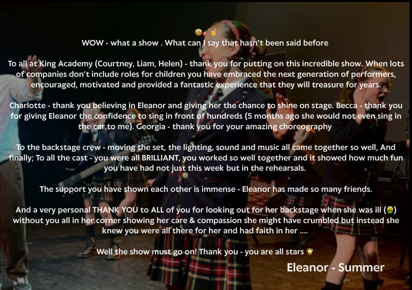 Below is our first production of: 'The School of Rock', showcasing both adults casting and child casting.